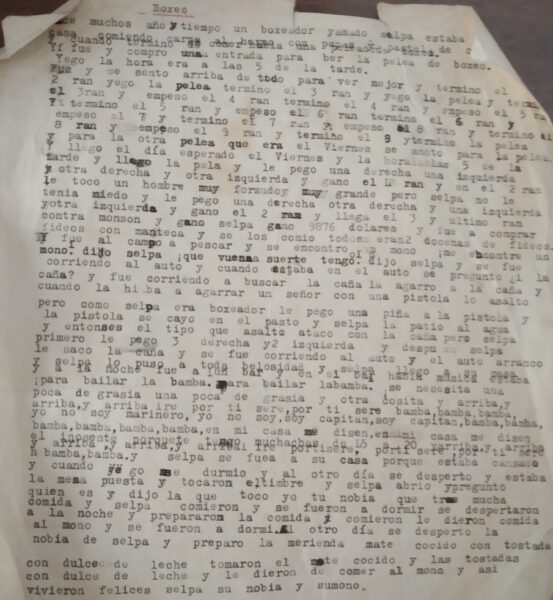 Yo me di cuenta de casualidad, no es que soy un iluminado. Un día entré en un cuarto donde guardaba los trastos de una vida anterior que no me animaba a desechar y ahí la encontré, tirada en el fondo, con el carrete salido y la cinta negra y roja desparramada a su alrededor. De solo verla, y encima en aquellas condiciones, un dejo de tristeza apareció y se me clavó en la garganta. Pero fue al sentir su olor, mezcla de tinta y metal, cuando me di cuenta de todo. Se me vino mi viejo escribiendo en ella en la mesa del living y yo sentado al lado leyendo, fascinado con aquel aparato y sus posibilidades. Escuché el repiqueteo de las letras en el papel, el ruido metálico de la creación. Ahí, entre sonidos y aromas, se me reconstruyó completo el living de mi infancia. Me fui a una tarde atemporal, quizás inexistente, idealizada, con la luz entrando por la ventana; vi las tres bibliotecas repletas de libros que nunca llegaría (ni llegaré) a leer y la tapa de la revista que mis padres hacían juntos encuadrada en una pared, y que, supongo, también aquella máquina vio nacer. Incluso, fui tan atrás en el tiempo que otra de las paredes de la casa todavía no existía, sino que era una cortina extraña que unía el living con el comedor. Y de repente me vi escribiendo mis primeros cuentos en la misma máquina, en el mismo living, y el ambiente llenándose de aquel olor, de aquel ruido, pero desde mis manos este vez. Recordé un día en el que al volver de natación nos cruzamos a un boxeador en la vía de Lope de Vega. Yo no tenía idea de quién era pero por algo, quizás por ese aura diferente que rodea a los tocados, lo miré. Él me guiñó un ojo y me dijo “Hola, campeón” al pasar. Ante mi sorpresa por el saludo de un desconocido, mi viejo me contó quién era (aunque ya me olvidé) y cuando volví agarré aquella máquina y escribí una historia sobre un boxeador/detective y un mono que luchaban contra el mal, una pequeña obsesión que tenía, imagino influenciado por los dibujitos (era fanático de Scooby Doo), de poner un animal de compañero y humanizarlo.